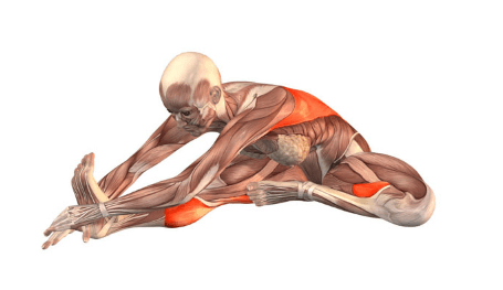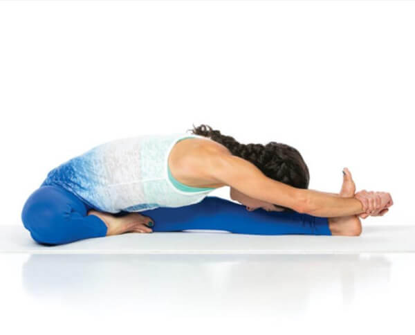 - Khi bạn thở ra, vươn 2 tay tới chân trái. Lại hít vào và duỗi tay để kéo dài cột sống, gập người xuống đầu gối cho đến giới hạn khả năng của bạn.